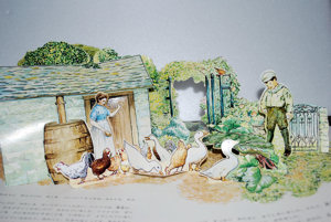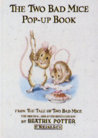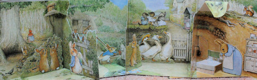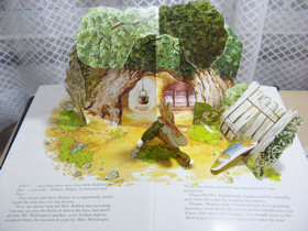 同じく飛び出す仕掛けPop-up絵本として、ピーター以外にジマイマ&2匹のわるいねずみも製作されました。 ●「The Jemima Puddle-Duck Pop-up Book」 FREDERICK WARNE (ISBN:0-7232-4122-8) 1985年 (洋書の画像なし) 日本語版) ![]() 「あひるのジマイマ しかけえほん」 ビアトリクス・ポター 岡松きぬ子(訳) 大日本絵画 (4-499-20943-9) 1989年 ![]() 最初のページ 最後のページ ●「The Two Bad Mice Pop-up Book」 FREDERICK WARNE (ISDN:0-7232-3360-8) 1986年 ![]() ●1991年改訂版 ![]() 「The Peter Rabbit Pop-up Book」 ↑ 冒頭シーンのPop-up FREDERICK WARNE (ISBN:0-7232-2950-3) 1991年 12ページ(274x200mm) - - - - - - * * * * * - - - - - - - ●ミニチュアサイズの飛び出す仕掛け(Miniture Pop-up) 通常のPop-up(274x200mm)より、小さいサイズのPop-up(145x105mm)で、1991年の改訂版「The Peter Rabbit Pop-up Book」の小型版。