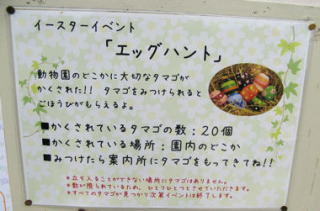 埼玉県こども動物自然公園で「Happy Easter Peter Rabbit 2011」のイベントが開催されました。イベント期間中の土曜日・日曜日・祝日は、エッグハントが行われ、園内のどこかにイースターエッグが隠され、それを見つけるとご褒美がもらえるというもの。 9時半の開園に少し遅れて入場すると、ピーターとベンジャミンがゲストを出迎えてくれました。 ![]() 男の子が「ベンジャミン」と駆け寄ります。 あと一歩というとこで「やっぱりこわい〜」と引き返します。 ![]() ピーターが子供達に手を振ります。 「ピーター」と女の子たちが駆け寄ります。 それを見たベンジャミン、ちょっぴり寂しそうです。全国のベンジャミンファンの子供たち、ベンジャミンを慰めてあげてくださいね。 入場ゲートのお知らせボードにエッグハントの遊び方とヒントがあります。隠されているイースターエッグの数は全部で20個。 ヒントは10個なので、ヒントの場所一か所につき1〜3個あるということに。 ![]() 開門と同時に一目散に走って入った子供たちは、ピーターラビットの森で既に見つけた様子。 まだオープンしたばかりというのに、コアラのいる東園側に向かう彩ポッポは満員で、その場所には確実に4個のエッグが隠されている。 東園に徒歩で向かっても間に合わないと判断し、西側の高台にいるサイチョウ(写真)コーナーに向かいました。 ![]() この日は、気温10度以下という4月なのにとても寒い一日でしたが、エッグ探しに夢中になっている間は寒さを感じません。そうこうする内に、とうとう植え込みの雑草の茂みに頭だけ出した状態で「あった〜!!」と見つけました。 イースターエッグは発砲スチールでエッグ型に切り取られ、彩色されたもの。透明のケースの中に入れられていました。周囲には誰も見当たらず、おかげで見つけることができました。サイチョウさん、ありがとう〜。 ![]() イースターエッグも見つけることができ、ようやくコアラのいる東園に到着。お母さんに抱っこされる赤ちゃんコアラ。 耳を折りたたみ、首を丸めて寝るコアラ。寝姿はクマのようにも見えたりして。 ![]() ワラビーも赤ちゃんがお腹の袋の中にいました。 カンガルーの親子? 袋の中から顔をちょこっとのぞかせる姿の可愛いこと。 ![]() 「エッグ見つけた!?」と思ったら、タマゴの展示コーナーでした。 東園は、アスレチック広場とピクニック広場がありましたが、どちらも子供たちの大人気エリアでイースターエッグは見つかりそうもありません。 ![]() イースターエッグは、案内所でご褒美に交換します。「どちらがよろしいですか?」と差し出されたご褒美は、埼玉県こども動物自然公園オリジナルのピーターラビットクリアファイルと、かすみ草の種が入ったピーターラビット種カードでした。そこでクリアファイルをいただくことに。 イースター・エッグハントのイベントを満喫して、午後は園内にある大東文化大学ビアトリクス・ポター資料館の開館5周年記念特別講演と特別企画に参加しました。 (2011.4.4 レポート 作成: ラピータ ラピータの部屋コンテンツ) 関連サイト:埼玉県こども動物自然公園: http://www.aya.or.jp/~sczoo/ |