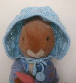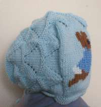 ピーターの編みこみでベビー用帽子を作ってと言われ、ピーターの編みこみ用本を見ながら製図を作成し、こんな作品が出来あがりました。 帽子本体は、原型のベビー用帽子を見本に側面と正面には模様を入れ、帽子の後ろ部分をアレンジしてそこにピーターを入れてみました。 ピーターのニットの本を見るとピーター部分は編みこみになっているのですが、一部分だけの編みこみは糸替え部分がどうしてもきれいな仕上がりにならないので、クロスステッチの要領でピーターラビットに仕上げてみました。 使用した毛糸 薄い水色の糸を1個ちょっと ピーター部分: ジャケット 青色、体 茶色、しっぽ 白、目には濃い茶色のボタンを使用。 ピーターの体にあった茶色の糸がなかなか見つからず、売り場にあったクロスステッチの刺繍糸を参考にしながらアクリルが50%混ざった茶色の糸が一番いいように思いこれにしてみました。 出来あがってみるとアクリルが混ざった糸なので、少し毛羽立った感じがうさぎらしくていいかなと思います。 |