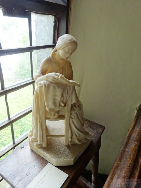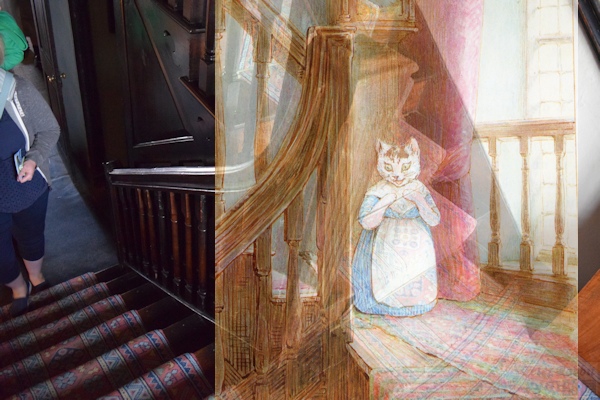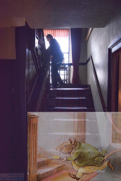 ▼ヒルトップハウスの2階へと通じる階段は18世紀に付け替えられたもの 英国 湖水地方ニアソーリーにあるヒルトップ農場のヒルトップハウス内部見学で、1階を見て回り、2階へとつながる階段にもたくさんのエピソードがあり、しっかりと見ておきたい。 ヒルトップハウスの2階へと続く階段(The Staircase)は、最初から取り付けられていたものではなく、途中で付け加えられたものだった。17世紀末に建てられたヒルトップハウスは、玄関ホールに小さな螺旋階段(spiral staircase)が取り付けられていた。 ![]() 18世紀、現在の階段部分が増築され、途中に踊り場がある折り返し階段に付け替えられた。階段の手すりは緩やかにカーブし、手すりを支える手すり子は、シャープな角材の間に木材を回転させテーブルの脚のように丸く削りとられた手すり子が並ぶ、とてもエレガントな手すりがつけられた。 ▼踊り場の装飾品 ![]() 階段の折り返し部分にある踊り場は、畳一畳分ほどのスペースがあり、手すり子と同じように丸く削りとられた木材で仕切られた柵があり、外壁部分に高さ2メートルはあろうかと思われる格子の枠がはめ込まれたガラス窓より、薄暗い玄関ホールに明るさを届ける。ビアトリクスは、階段の踊り場から玄関ホールまで明かりが射しこむ大きな窓と、エレガントな手すりがついた階段を気に入っていた。 ![]() 『ひげのサムエルのおはなし』の冒頭、タビタお母さんがトムを探している場面で階段が描かれた。この場面でタビタお母さんの後ろに描かれたのは、踊り場に設置された「ロングケース・クロック」。 ![]() ロングケース・クロック(Longcase clock)は、高さ2メートル50センチあり、現在はホール・クロックと呼ばれる振り子時計で、アメリカの呼び名はグランドファーザー・クロック。18世紀のショーフィールド社(Schofield)のもので、ビアトリクスは「時計の音はゆったりとした心臓の鼓動のよう」と、結婚後住居をカースルコテージに移してからも「古い家が寂しくないよう付き添いに行く」と、毎日のようにヒルトップハウスに出かけたそうだ。 ![]() 大きな窓の前に19世紀初頭に活躍したイタリアの彫刻家ピエトロ・マーニ(Pietro Magni)の「本を読む少女」の摸刻像(本物よりひと回り小さいサイズ44x27センチ)が飾られている。この像の飾り台としてビアトリクスが使用したのは、「棺(coffin)」と呼ばれる17世紀のスツール(coffin stool)。 「地元で棺桶をスツールの上に載せ、そのスツールのことを棺桶スツールと呼ぶ」ことから、そんな名前がつき、スツールを使用するのはご遺体をネズミから守るための風習が残っていることからだそうだ。座面の四方が折りたためる長方形の椅子のことで、彫像の下のスツールも見逃せない逸品(珍品?)だ。 ![]() 踊り場の窓より眺められるニアソーリー村の景色。ビアトリクスも何度となく眺めたであろう場所に自分が立っていると思うだけで感慨深い。 ▼挿絵に描かれた同じ目線で撮影しよう ![]() 階段を上った先は、『ひげのサムエルのおはなし』でサムエルがめん棒を転がし運ぶ場面に描かれた。 ![]() そうそう話が前後するけれど、めん棒の前にバターも失敬したサムエル。こちらは階段の上り口部分が描かれ、大きな窓から射しこむ光が眩しい中、ネズミの通路を通らずにふてぶてしく階段を上るサムエル。もし挿絵と同じ角度で撮影するならば、階段の左側の一人立てるだけのスペースがあるところから撮影すると、階段の向きが挿絵と同じになる。 『ひげのサムエルのおはなし』はヒルトップハウスの内部が詳細に描かれていて、私達訪問者を絵本の世界へといざなってくれる。 |