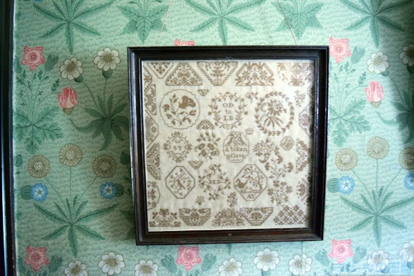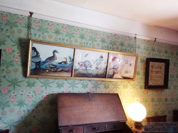 ▼2階で見学できるのは4部屋あり、まず寝室へ ビアトリクスが本の印税と、叔母からの遺産を資金にヒルトップ農場を購入したのが1905年。それまでに既に6冊の絵本を出版し、1907年出版の『こねこのトムのおはなし』、1908年出版の『ひげのサムエルのおはなし』『あひるのジマイマのおはなし』からヒルトップ農場や、ヒルトップハウス、農場のあるニアソーリーが絵本の舞台として度々登場する。 と、これまでの大事な年号をおさらいをして、さて続きを。 ヒルトップハウスの2階は、寝室、宝物部屋、プライベートの居間、ニュールームの4つの部屋が公開されている。 ![]() まずは寝室へと足を踏み入れた。ベッドの横に置かれているのは「アメリカン・ウィンザーチェア(Windsor chair)」で、シェーカー教徒が1800年頃に作ったシェーカー家具。ビアトリクスはこれを「永遠に残すべきもの」と思うほど特筆すべき素晴らしい椅子。 ▼見事な模様が施された天蓋付きベッドは1914年頃に購入したもの 寝室の場面で真っ先に思い出すのは、『こねこのトムのおはなし』で、「悪いことしたこどもはベッドで寝ていなさい」と寝室に閉じ込められる場面に描かれたベッドを思い出す。当然、この場面で描かれたベッドが寝室にあるのかと思いきや、さにあらず。『こねこのトムのおはなし』が出版されたのは1907年。寝室のベッドを購入したのは、ビアトリクスが結婚して住居をヒルトップハウスからカースルコテージに移り住んだ1914年頃。 ![]() 改めてベッドを見てみると、4つの柱で支えられた17世紀の湖水地方産 天蓋付きベッド(Four-poster bed)で、天井部分はひし形に彫られたパネルが16枚はめこまれ、へッドボード(Headboard)にも見事な模様の彫刻が掘られている。 ベッドの周りを囲うようにかけられている濃い緑色のダマスク柄生地のカーテン(Bed hangings)は、カーテン上部のレールが見えないように覆うヘッドクロス(Head cloth)もセットになり、そのどちらにも花柄模様が刺繍されている。 ![]() この刺繍は、ビアトリクス本人が金襴ブロケード(今風に書くと、カラフルな絹糸)で刺したもので、「外にあまり出かけられない私にとって刺繍することは良い娯楽」と晩年70歳を迎える前より刺し始めたもの。 1914年以降の作品でベッドが描かれているのは『妖精のキャラバン』の口絵で、緑色のカーテンとお揃いの生地のヘッドクロスも描かれた天蓋付きベッドがある。まったく同じではないものの雰囲気はそっくりだ。 ▼寝室の壁紙はウィリアム・モリスのディジー模様 ![]() さらにこの部屋の最大の特徴である壁紙は、ウィリアム・モリスのデイジー(ヒナギク)模様。他の部屋と違って、モールディングで仕切った上部にデイジーの壁紙、下の部分は同系色の模様無しと貼り分けている。 ビアトリクスはモリスの壁紙について「水彩画作品や写真など飾る場合にはとても不向きな壁紙、でも天蓋付きベッドの背景にはとてもふさわしい壁紙」と語った。 ![]() パッチワークのキルトカバーも同じくアメリカ製。 ![]() 椅子といえば、冒頭の『こねこのトムのおはなし』で寝室に転がっていた椅子。 ![]() 寝室のベッドと反対側の壁、ブランケットチェストの脇に置かれている1700年代のウィリアムアンドメアリー様式の椅子は、座面が籐(cane-seated)を編み込んで作られたもの。もしかしたらこねこのトムたちが暴れてひっくり返した椅子はこの椅子かと思ったら、絵本に描かれたものとは少し違っている。 後日、ナショナルトラストコレクション(←ここをクリックするとコレクションが見られます)から、絵本に描かれたそっくりな椅子(座面の膨らみ具合や背もたれのデザインなどから)を見つけた。座面がイグサで編み込まれた1800年代の椅子。ホークスヘッドにあるビアトリクス・ポター・ギャラリーにて展示されていることになっているが、入ってはいけない扉の向こうにあったので撮影できなかった。 ▼寝室の装飾品 ![]() 壁に掛けられたオウムと鴨の3枚の絵画をひとつの額に入れている作品は、サミュエル・ディクソンのグワッシュ画法で描かれた1750年頃の作品。この作品の裏にビアトリクスのメモ書きで「子どもも見ると思うからオウムの作品(真ん中)の上に描かれた蝶を取り除くべき」とある。確かに空を飛ぶ見た目がクラゲのような蝶で不思議な感覚に陥るので、最もな意見かも。 ![]() ビアトリクス自身が刺繍したベッドカーテンとは別に、寝室には二つの「サンプラー」と呼ばれる刺繍作品がオウムと鴨の作品の両脇にかけられている。 サンプラー(280x270mm)は、手芸の技を磨くため、色々な柄やアルファベットを寄せ集めたデザインのことで、ビアトリクスはこれをどのような経緯で入手したのかまでは分かっていないものの、金色の糸のみで仕上げた縫い目がとても細かく、またモチーフの位置決めの正確さなどから仕上げた人の技術の高さが伺える作品。もうひとつのサンプラー(←ここをクリックするとコレクションが見られます)は