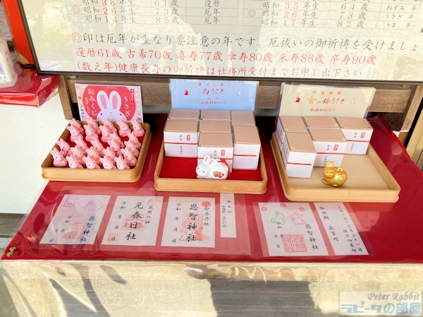 ![]() 手水舎には、跳ねてるうさぎとくつろいでいるうさぎ。 ![]() 拝殿 恩智神社の由来は、大和時代(470年頃)まで遡り、平安時代に編纂された『令集解(りょうのしゅうげ)』に、 日本の古社 八社として、河内国は恩智神社が、摂津国は住吉大社が重要な社として記されていたとか。 ![]() 拝殿前の神兎(なでうさぎ) 以前うさぎ神社として住吉大社をご紹介しましたが、恩智神社も江戸時代末期まで住吉大社と夏祭りを行い、 その時の神のお遣いとしてうさぎが先導したと言い伝えられております ![]() 拝殿の壁画に描かれているうさぎ。 今にもお空に昇りそうな勢いです。というのもこの神社は、うさぎと共に鎮座しているのが龍なのです。 御祭神の大御食津姫大神(おおみけつひめのおおかみ)のお遣いが龍とされ、 うさぎと龍が仲良く並んで鎮座する全国でも珍しい神社です。 ![]() 本殿の神縁兎と神龍 御祭神の彦神と姫神の「神兎」が執り持つ良縁と、天地を守護する「神龍」が導く昇運と幸福が結ばれるとされ、 うさぎと龍の形をした祈願紙を結んでお祈りすると願いが叶うとか。 ![]() さらにこの神縁兎は、オスとメスが仲良く寄り添っていることから、なでると良縁に恵まれるとか。 ![]() 張子の龍と兎 干支の引き継ぎみたいですが、ここでは常にどちらの御利益も得ることができます。 ![]() 開運招福の干支絵馬 ![]() 3月限定の御朱印 500円 ![]() ![]() ![]() うさぎみくじに、土鈴に、うさぎ絵馬にと色々ありましたが、金の鈴うさぎ(800円)を拝受しました。 ![]() 金のうさぎは2個目です。色々なうさぎ神社を巡るたび、うさぎの置物が続々と増えていきます。 目が合うと思わずほっこり笑顔になれる良いお顔をしています。 龍とうさぎのご利益を賜りにぜひお出かけになられてみてはいかがでしょうか? |