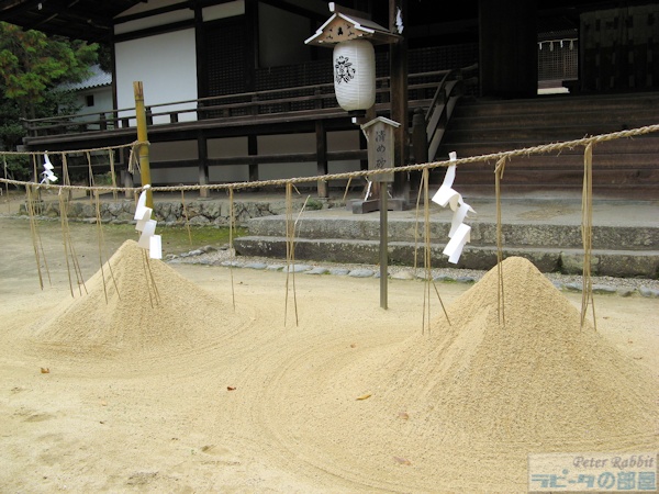![]() 宇治上神社 ![]() 立派なご神木、ケヤキは樹齢300年。 ![]() 本殿は、現存する国内の神社で一番古い1060年頃の建立だとか。 ![]() 拝殿前に「清め砂」が盛られています。 ![]() 本殿の横に天降石(てんこうせき)と呼ばれる大きな岩があります。この石の上に願い事をした小石を無事に乗せられたら、 その願いが叶うそうです。 どこにウサギがいるのと心配された方、お待たせしました。 ![]() 願い人形(ひとかた) 十二単の絵姿が描かれた人形に、兎の絵が描かれています。 現在は「宇治」という地名ですが、「莵道」と書いてうじと呼んだところからきているそうで、十二単の柄にも描かれているようです。 ![]() 兎模様のお守り |