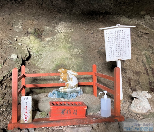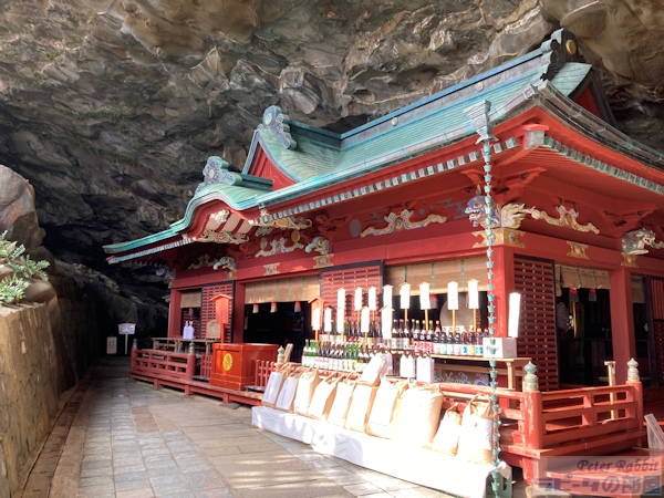 | 宮崎県でうさぎ好きなら立ち寄らずにはいられないうさぎ神社巡りその3鵜戸神宮へ。 日南海岸の日向灘に面した断崖絶壁の下に本殿があり、どうしてこんな所に神様がと不思議な気持ちになりました。 ![]() 参道には寄贈されたうさぎの石像が9体あり、出雲大社で見たうさぎとそっくりでした。この神社の神使が兎だったため、縁の深い動物として慕われているそうです。 ![]() うさぎ、うさぎと数えながら本殿へ。本殿はこの階段の下、左側の崖の中にあります。本殿の天井の岩盤は、宮崎層群と呼ばれる地層のなかでも飛びぬけて厚い砂岩の層で、コンクリ―ションという丸いボールのような塊を含んでいるそうです。このコンクリ―ションという現象が絶妙な条件が揃った時にしか起こらないために、この境内でしか見られない地層とか。ブラタモリでも紹介されたそうです。 ![]() 本殿の奥にある撫でうさぎ うさぎを撫でると病気平癒開運飛翔の願い事が叶えられると言われているそうな。 ![]() 撫でられすぎて元々は白うさぎだったのかもしれませんが、そのうち黄金色に光り輝くかもしれません。 ![]() 鵜戸神宮は、うさぎ絵馬、うさぎみくじに、うさぎお守、うさぎ土鈴、破魔矢の台にうさぎがあしらわれと、うさぎづくしなんです。どーしましょうという感じで、開運と家内安全の招福うさぎ守にしました。 ![]() 最初の疑問、どうしてここに神様がというのは、神々の家系図が必要な説明で少々長くなります。木花佐久夜姫の息子の火遠理命(山幸彦)が、妻の豊玉姫との間に生まれた子ども、鵜葦草葦不合命を鵜戸神宮のある洞窟の中で産んだとされ、豊玉姫は実は人魚でその姿を見られ海に帰ってしまうのだけど、子どもがいつでもおちちが飲めるようにと、本殿の裏におちち岩が本当にあります。 ![]() さらに豊玉姫が急いで海に帰られたので、お付きのカメは姫を待ち続けいつまでもそこに残りカメ石になりました。このカメ石の升のくぼみに運玉が入ると願いが叶うということで、100円で運玉5つ購入し主人が挑戦。男性は利き腕で投げたらダメというルールがあり残念ながら入らず。利き腕なら絶対入ったのにとかなり悔しそうでした。 私はうさぎパワーをもらうつもりが、はしゃぎすぎてまだ午前中なのにクタクタになりました。 ![]() 御朱印 500円 |