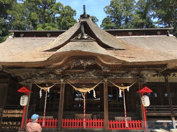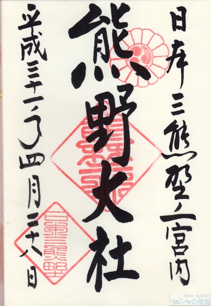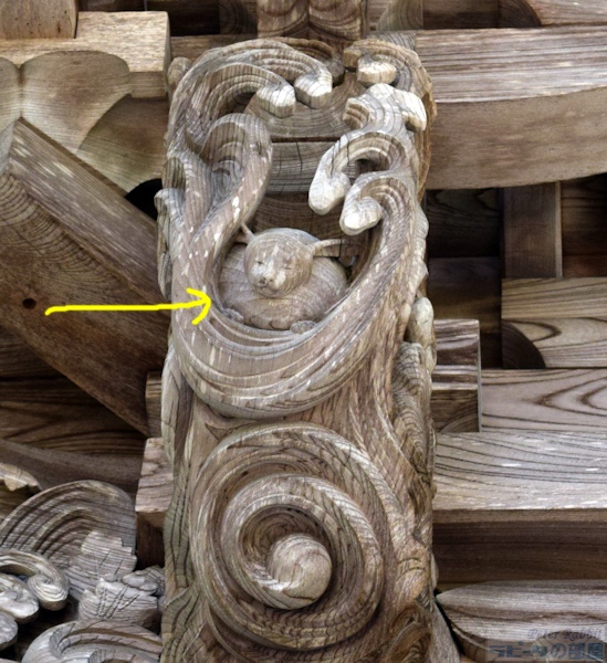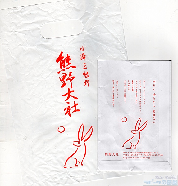 熊野大社は、山形県南陽市にあり、夫婦の神様で縁結びの御利益があるそうです。ここは「三羽のうさぎ」を見つけると願いが叶うという言い伝えがある神社で、うさぎ好きにはたまらないスポットです!![]() 拝殿 萱屋根の拝殿。 ![]() 小さな社が並ぶ先に本殿があり、その横に「三羽の兎」の案内板 ![]() 矢印に添って本殿裏に進むと、20人ぐらいの人だかりができていて、皆一斉に上を見上げていた。見上げた先にあるのは、本殿屋根の下の彫刻。ここに「波に兎」の隠し彫りがされていて、3羽全部見つけると願い事が叶う、幸せになれるという言い伝えがあるそうな。 ![]() 授与所で配布されている「三羽の兎に出逢う手引」 こちらには2羽の兎が隠れている場所を示していて、すべての隠し場所を人から教えてもらうとご利益が無くなるので、「3羽目は自分で探して」とあります。 ![]() 1羽目は猫のような兎。こちらは探さなくてもすぐに見つかりますが、これを兎として良いのかどうか疑問。 ![]() 2羽目は手引の示す場所をよく観察すると、こちらは兎で間違いない「波に兎」というお姿でした。 ![]() 3羽目が難しい。場所も分からないし、見上げてばかりで首が痛くなるし、目がチカチカして限界でした。すぐに見つかると思ったけれど甘かったようです。主人が撮影した写真を拡大しながら見つけてくれて、こっそり教えてくれました。人に教えるとご利益なくなってしまいますが(^^; 写真に「注目!」としましたが、場所は書いてないから大丈夫?ですよね。 ![]() 3羽目の兎 写真を拡大しても兎と分かるかどうか。。。これが正解かどうかも分かりませんが、きっとこれが3羽目だと思われます。気がつけば30分間も兎探しに夢中になっていました。 ![]() 熊野大社の御朱印 ![]() 結ひうさぎのお守り かわいい!! ![]() 中におみくじが入っていて、一番可愛い顔をした子を選んだのですが、おみくじは30番「吉」でした。 ![]() 紙袋とビニール袋 月を見つめるうさぎがデザインされたもの ![]() ねがひぶみ こちらもうさぎが願いを叶えてくれるようです。 うさぎ好きにはたまらないスポットですね。ぜひ3羽の兎を見つけて願いを叶えてくださいね。 |