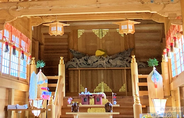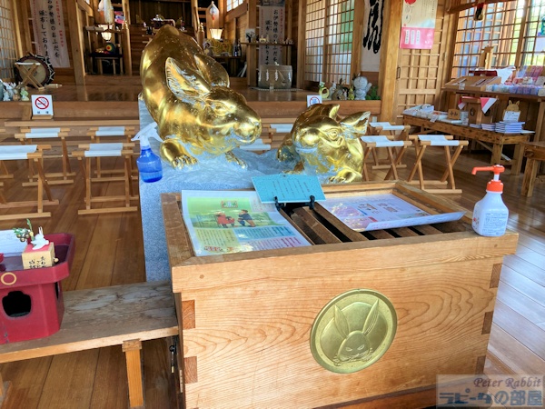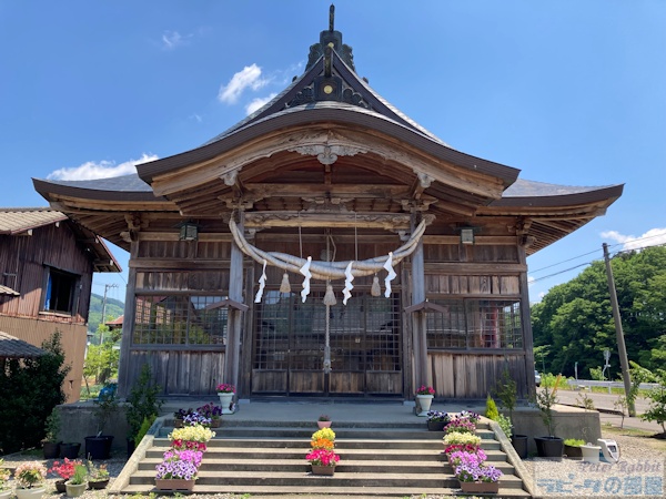 ![]() 拝殿 社務所で御朱印を頂こうとピンポンを鳴らしましたがお留守で電話も通じません。 しばらく待つことにし、参拝しようとお賽銭入れを探すも見当たりません。 どうしたものかと思ったら拝殿の扉には鍵がかかっておらず、そぉっと中に入ると。。。 ![]() 光兎山(標高966m)に金の光の雫と共に月読尊の使いである月の兎がこの山に降り立ち、この村の守り神になったことから、光輝く兎が光兎大神として祀られています。 ![]() 金箔兎神像 金色に光り輝く兎様がお賽銭入れの上に鎮座していました。 ![]() 「願掛けをし兎に金箔を貼り輝かせる事により、願いを成就しましょう」とのこと。その下に金箔の貼り方の説明もありました。 兎様の耳やお腹の一部に輝いていない部分がありましたが、貼るのが難しい部分が残っているという感じでした。 ![]() 兎守りに、 ![]() 兎模様の神紋がデザインされた満月玉、兎柄の御朱印帳、 ![]() 兎おみくじ(500円)もありました。 初穂料は、お賽銭箱に納めてくださいと書かれていたので、兎おみくじを頂いてきました。 御朱印を頂きたくてはるばるやってきましたが、神社はお留守のため途方にくれました。 どうしても諦めきれず、神社の近くに古民家カフェ「元麹屋」のリーフレットが本堂内にありましたので、一旦引き上げて再び立ち寄ることにしました。 ![]() 古民家カフェのビーフカレーは、光兎山にちなんでライスがウサギになってます。可愛い! 再び神社に戻りますと、花壇の手入れをされている方がいらして意気揚々御朱印をお願いしましたら、なんとこの日は宮司さんがお留守とのことで頂けませんでした。 ![]() 絵馬も兎柄 ![]() 境内にある立派なお倉も兎柄 ![]() 光兎神社 |
