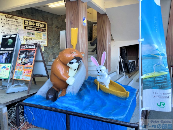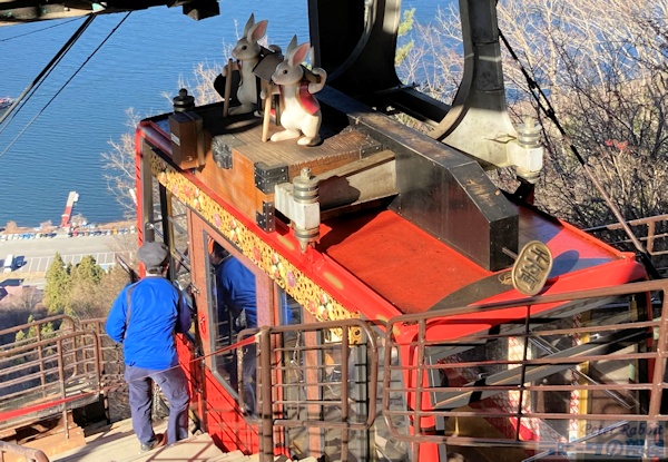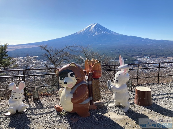 河口湖畔にある天上山(標高1104m)は、別名「カチカチ山」とも呼ばれます。 それは、昔話「カチカチ山」の舞台で、タヌキが泥船で沈んでいくのが河口湖だったと言い伝えられていることからです。 文人 太宰治は『お伽草子』の「カチカチ山」のお話の中で、 「これは甲州、富士五湖の一つの河口湖畔、いまの船津の裏山あたりで行はれた事件であるといふ」と書いています。 ![]() ロープウェイ入口 さて、そんなカチカチ山の舞台、天上山へ行ってきました。 至る所にカチカチ山のお話を再現したオブジェがあります。たぬきは泥船に、 うさぎは木船に、そして私たちはうさぎのかごやに乗って天上山へ。 ![]() 天上山には富士山パノラマロープウェイ(片道500円、往復900円)のうさぎのかごやに乗車し、 2分30秒で山の上にある展望台までひとっ飛びです。 ![]() うさぎのかごやの内部もうさぎ柄で統一されています。タイミングよくうさぎのかごやに乗車できましたが、 運が悪かったら?たぬきのかごやかも。うさぎとたぬきが交互にやってきます。 ![]() そんなカチカチ山にうさぎ神社が鎮座しています。昔話「カチカチ山」とも通じる内容で、 昔々天上山にウサギの棲家があり、働き者であったウサギはおじいさんとおばあさんの手伝いをしていて、 よく天上山から三つ峠の方に出かけ行ったそうな。 そんなウサギは、いつしか軽やかな身のこなしから「健脚」の神使として、 さらに急坂をやすやすと登っていく姿から「大願成就」の神様として、うさぎ神社に祀られるようになりましたとさ。 ![]() 狛兎 標高1000m越えに鎮座する神社なので、気温差で石像にひびが入り割れてしまわないか心配です。 ![]() お顔洗い中のティモテ狛兎 ![]() 御祭神 まぁ、なんということでしょう。うさぎ神社の兎様、なんとも神々しい!!お参りに来たかいがありました。 ![]() おみくじ奉納所と富士山 ![]() うさぎ神社の絵馬 ![]() うさぎ神社から天上山山頂へと続く道を10分ほど登りますと、分祀された小御嶽神社の祠がありました。 本宮は、富士山吉田口五合目の小御岳山頂にある富士山小御嶽神社です。 富士山と対峙するこの場所に富士山入山者の無事を祈るために分祀されたそうです。 ![]() うさぎ神社のうさぎ御守り ![]() うさぎ神社の御朱印 400円 ![]() うさぎ神社ってご利益あるのかしらって思っていましたけど、うさぎ好きにはたまらない キュートな御祭神で驚きと共にひとめぼれしましたよ。ぜひ皆さんもご参拝なさってくださいね。 また天上山は、富士山の眺望が素晴らしいビュースポットですので、ダイナミックな景色をご堪能ください。 |