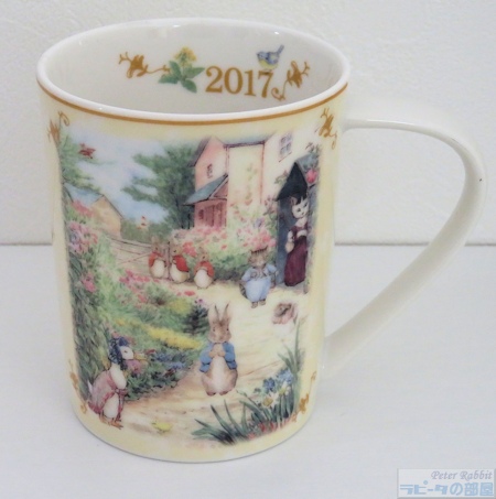 2017年 イヤーズプレート デザインは、こねこのトムの家であるヒルトップ・ハウスに、ピーターたちとジマイマとティギーおばさんが遊びに来ています。背景であるはずの花々がとても美しい色合いでキャラクターたちを引き立てます。 2017年 イヤーズマグ 2017年からイヤープレートとお揃いの柄でマグカップも同時に販売されています。 ![]() ![]() 記念の年号はマグの内側に入っています。 |